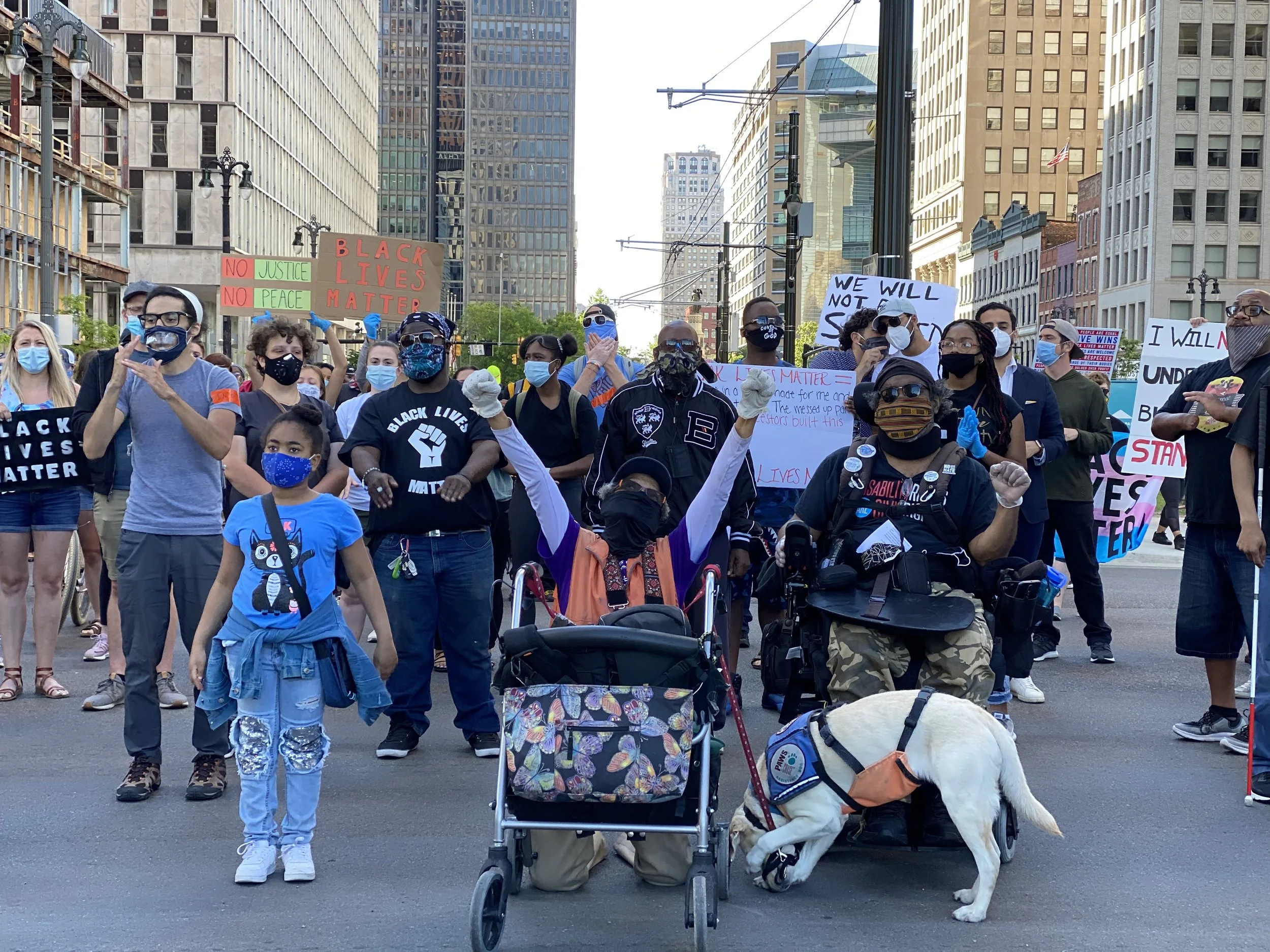 Photo by Teddy Dorsette III: Three people wearing bright orange hoodies that say "Count Every Vote" march in a protest. One is holding a "count every vote" sign. Another raises a fist from her wheelchair. They are wearing masks that say Detroit Disability Power.