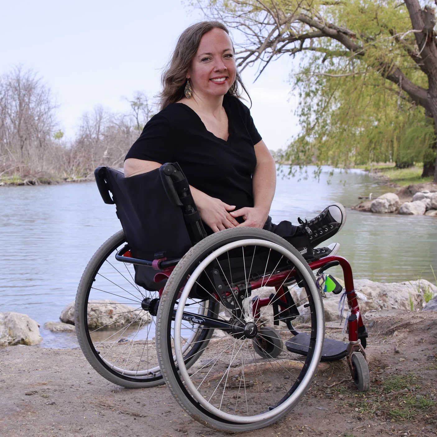 Image Description: Circular portrait of Dessa sitting in her wheelchair in front of trees and water. She smiles in a black tee shirt with shiny, dangling earrings. She has long blonde hair and light skin. Her arms come together in front of her lap with her fingers interlaced.